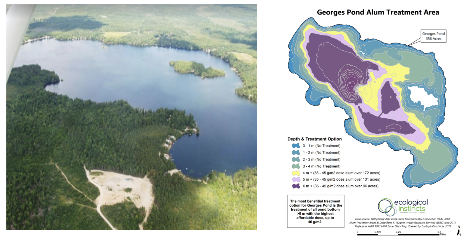 Results of the water quality analysis and watershed modeling indicate that over half of the phosphorus load to Georges Pond is from internal phosphorus (P) recycling (P released from bottom sediments during periods of low oxygen in deeper waters). The WBMP prioritized addressing the internal phosphorus load in coordination with targeted phosphorus reductions throughout the watershed. Project partners include the Georges Pond Association, Maine DEP, Ecological Instincts, and WRS, Inc.